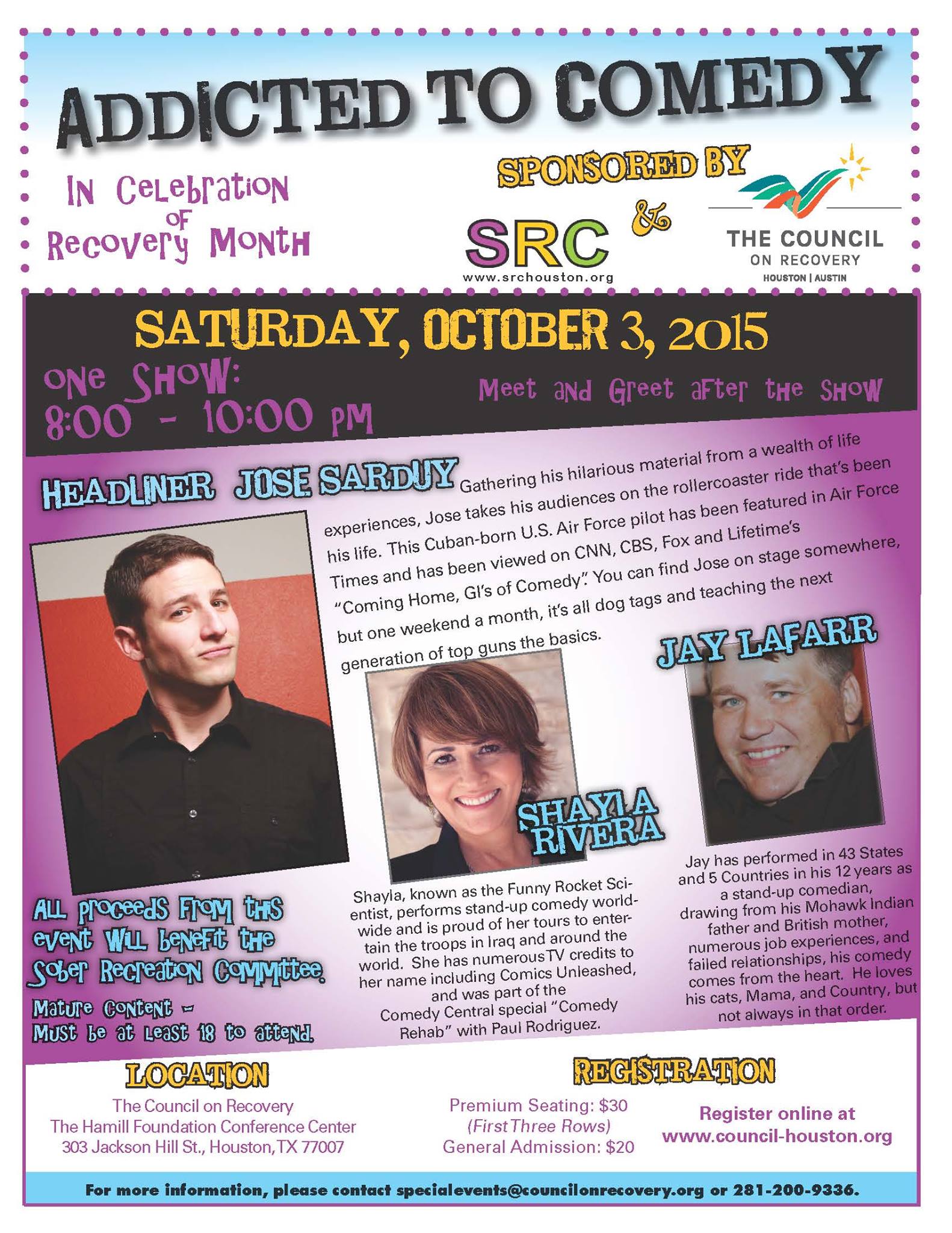 ADDICTED TO COMEDY September 14, 2015 by comedysceneinhouston 0 303 Jackson Hill Houston, Texas 77007 For Tickets Click Here! Share this: Click to share on X (Opens in new window) X Click to share on Facebook (Opens in new window) Facebook Like Loading... Related